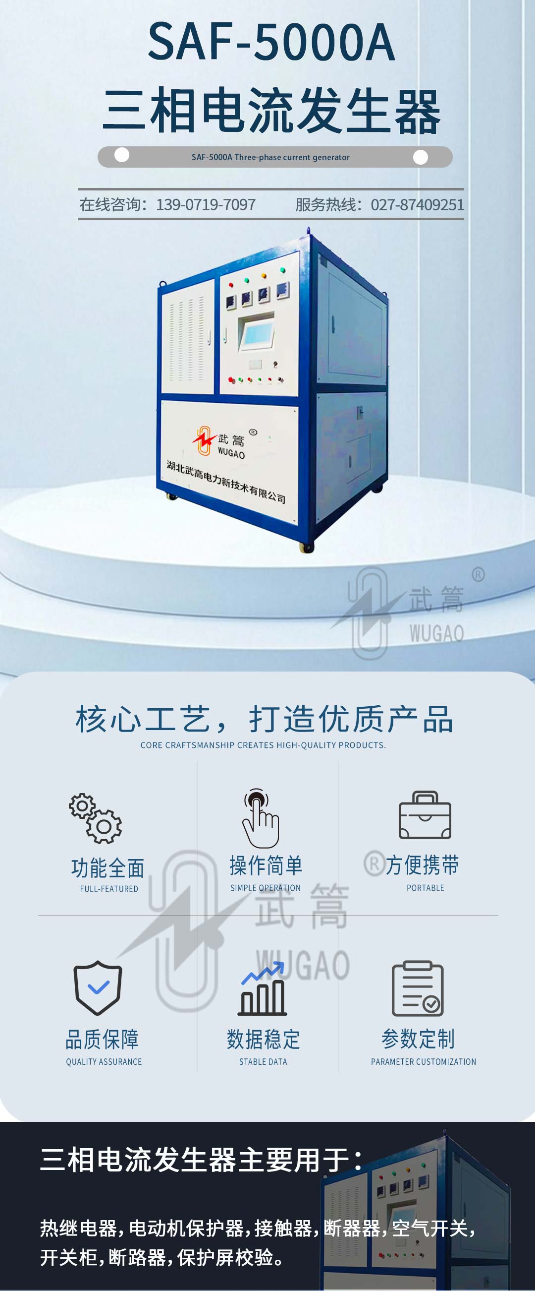 SAF-5000A三相電流發(fā)生器(簡稱三相升流器),我公司自行研制開發(fā)的測試設(shè)備,它集國內(nèi)外同類產(chǎn)品的優(yōu)點于一身,采用數(shù)控技術(shù),抗干擾能力強,和上一代升流器相比,由于采用低功耗、大容量的自藕調(diào)壓器和高導(dǎo)磁率鐵芯制作的變流器,具有輸出功率大,體積小,重量輕等優(yōu)點。主要用于熱繼電器,電動機保護器,接觸器,斷器器,空氣開關(guān),開關(guān)柜,斷路器,保護屏校驗。