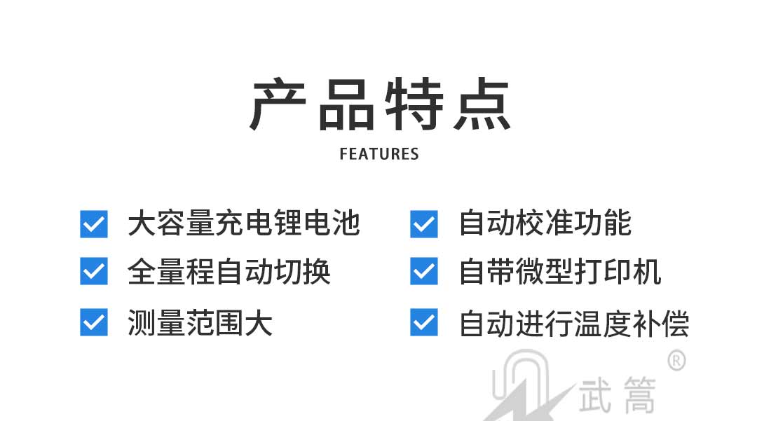 量程自動(dòng)切換功能、 鹽密測量范圍大、自動(dòng)進(jìn)行溫度補(bǔ)償、儲(chǔ)存和打印功能、大容量充電鋰電池、自動(dòng)帶電修正系數(shù)等。
